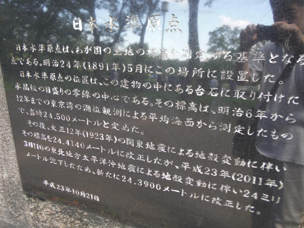 この建物は日本水準原点標庫といい、建物の中には目盛りを刻んだ水晶の板があって、その目盛りの零線の中心が日本の標高の原点=日本水準原点なのだそうです。そしてこの原点の標高…24.3900メートル…を基準に、例えば富士山の標高3776メートルが決定されるわけです。